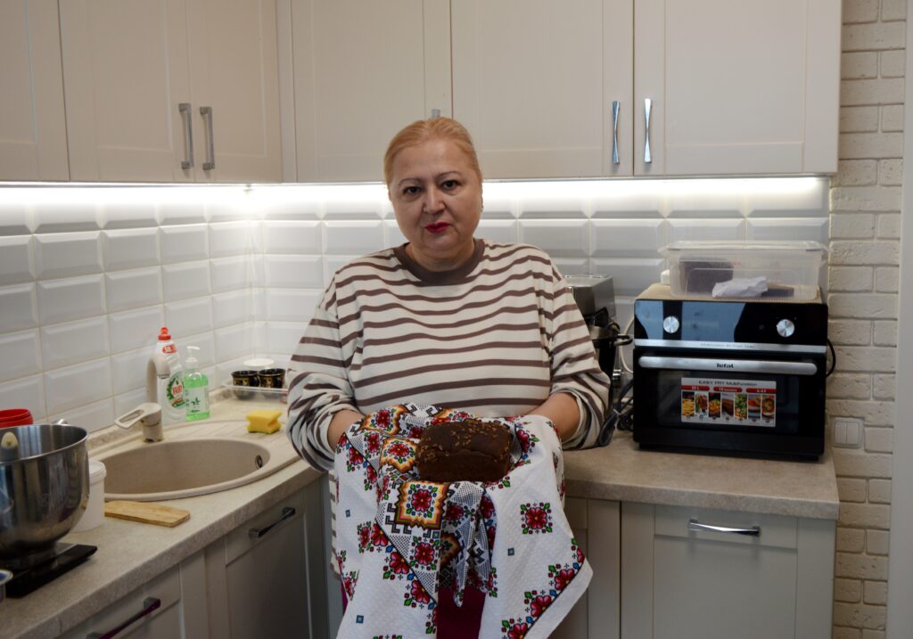 «Я не готувала хліб раніше, але коли ми були без світла, без води, без опалення більше місяця – виникла така потреба. Я навчилася робити закваску і вирішила: якщо буду пекти, то тільки на заквасці, бо для мене це найароматніший і найкорисніший хліб», – розповідає героїня.
